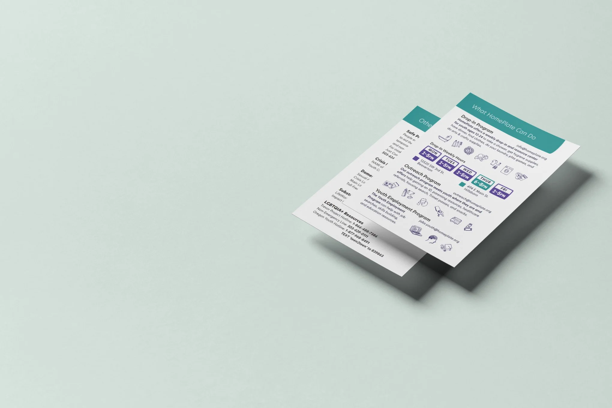 We designed out new business cards that offered staff different ways to communication with youth depending on their needs. Staff could choose from one of three designs depending on the most effective ways for them to talk with the youth they served specifically.